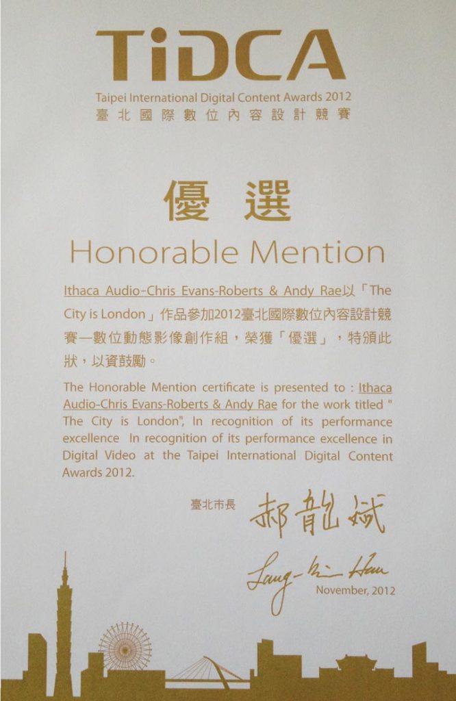 Chris Evans-Roberts and Andrew W Rae have both received an honorable mention at the 2012 Taipei International Digital Content Awards for their collaborative effort on the audio visual project ‘The City is London‘.